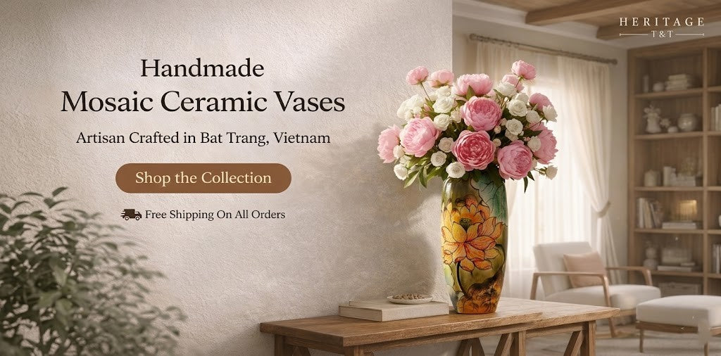 Handmade Mosaic Ceramic Vase – Artisan Design – 28 cm (11 in) – Home Décor – Heritage T&T 3D Collection – Bat Trang Vietnam